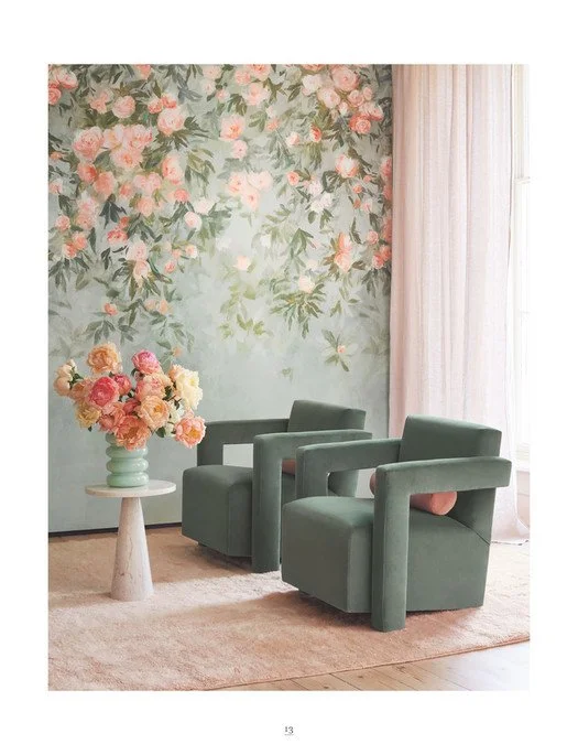 “ Dappled light through a majestic forest and the awakening of burgeoning blooms can be felt through these transportive wallcoverings and murals. A cascade of painterly roses and a diffused landscape celebrates artistic spontaneity, while trailing berries and delicate gingko leaves are rich with elegant detail. Subtle but significant textures and considered dustings of metallic, add a final flurry of intrigue and sophistication to this memorable offering of wallcoverings. “