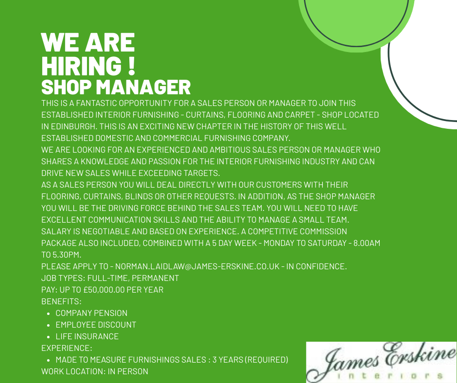 This is a fantastic opportunity for a Sales Person or Manager to join this established Interior furnishing - Curtains, Flooring and Carpet - shop located in Edinburgh. This is an exciting new chapter in the history of this well established domestic and commercial furnishing company.